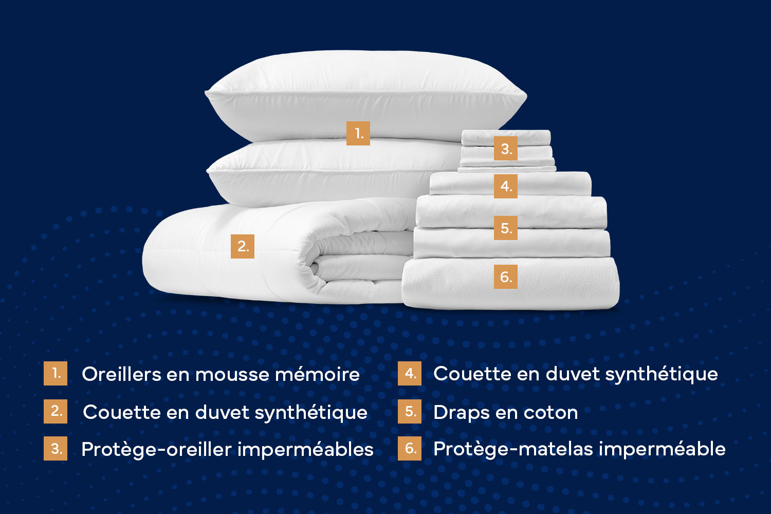 *Conditions : Offre valable jusqu’à épuisement des stocks. L’offre sera appliquée automatiquement lorsqu’un matelas sera ajouté au panier. L’offre s’applique à un maximum d’un (1) ensemble confort de sommeil de la même taille que le matelas ajouté au panier. L’ensemble confort de sommeil comprend 2 oreillers, 1 protège-matelas, 1 ensemble de draps, 1 couette, 1 housse de couette et 2 protège-oreillers pour les commandes d’un matelas de taille Double, Grand/Queen, Très grand/King, Très grand cal/King cal ; 2 oreillers, 2 protège-matelas, 2 ensembles de draps, 1 couette, 1 housse de couette et 2 protège-oreillers pour les commandes d’un matelas de taille Très grand divisé/Split king ; 1 oreiller, 1 protège-matelas, 1 ensemble de draps, 1 couette, 1 housse de couette et 1 protège-oreiller pour les commandes d’un matelas de taille Simple XL, ou Simple. L’offre ne peut être appliquée de façon rétroactive. Notre politique générale de retour s’applique à tout retour. L’offre peut être modifiée sans préavis.